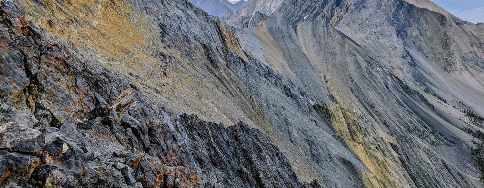 The sun was up enough for us to see without lamps. We slowly make our approach to COR. My steps are heavy but calculated as I am fearful of COR. I send a heartbeat text. That familiar and friendly chirp sounds. As we started the COR ascent, I still didn't know what to expect of her infamous ridge. I had done plenty of research on the mountain, and it is clear that COR is the most hyped part of the whole Borah Peak experience. And, I would be lying if I didn't admit that COR scared me. But I had faith in myself and the mountain. I would take it slow and bit by bit. Our small group had partially split by this point, and it was just the two of us. We met up with three or four other hikers who got to COR at the same time as we did. We talked briefly about the best way to approach the ridge, which wasn't immediately clear. You can either go high on the shelf or lower. The lower path is probably the safest and most accessible way forward, but the scree (loose rock like shale) concerned me; it's a long way down if one loses their footing or is absent-minded even for the briefest moments. The majority of the group takes the lower path. I follow a guy with a look of raw adventure in his eyes and decide to take the high side—another calculated decision involving high risk.